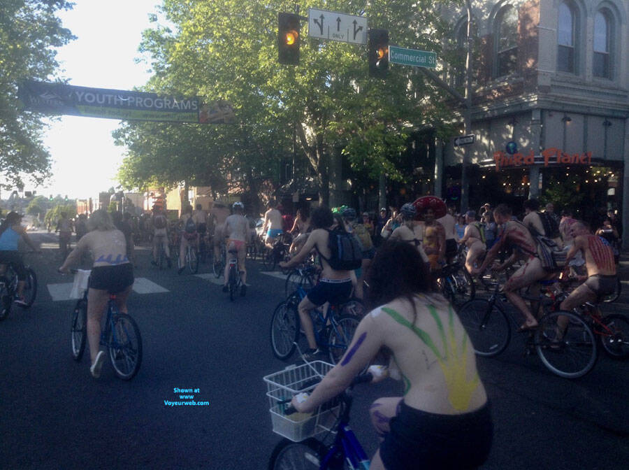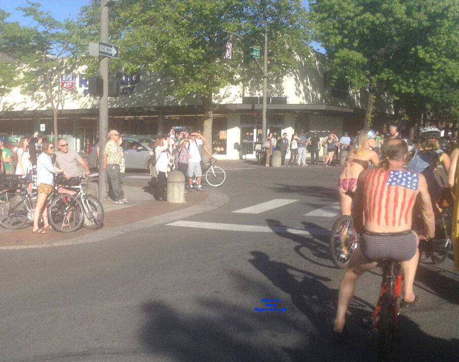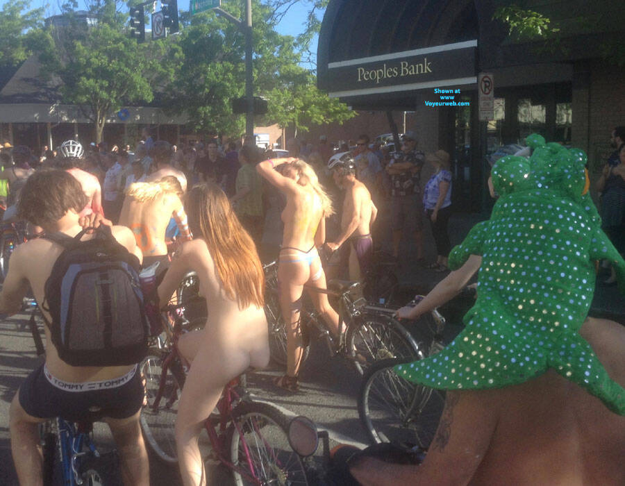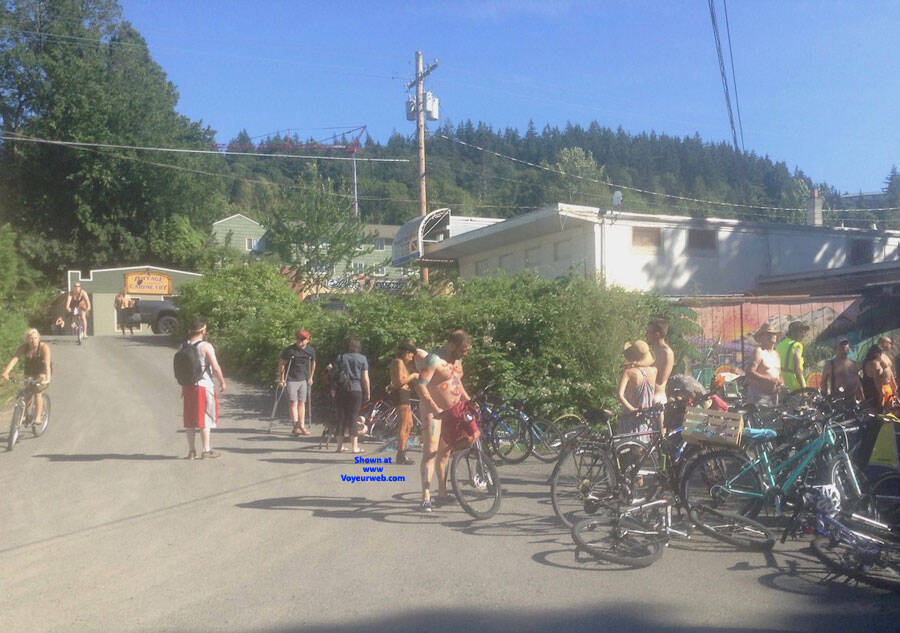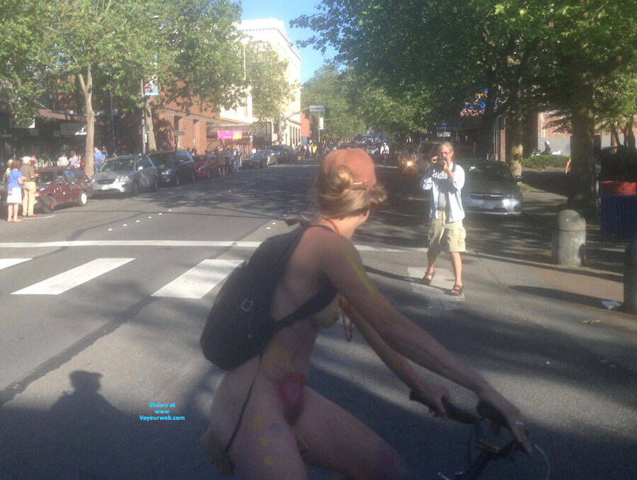 The Bellingham World Naked Bike Ride is hours of naked fun in the sun! The ride begins at a bike shop behind a scuba diving shop, but before that is a paint party for any kind of body painting to allow people to "protest" but for most people it's light hearted fun and a way to be nude in public without being totally visible. There's a lot of college students that participate, and the gender mix is very even, but most of the ladies are too timid to be totally nude, and many of them wear thong panties, and many participants give off a strong vibe of being real hippies. Bellingham Washington is kind of a small town, but the naked bike ride is a big deal, and it has been estimated that about 300 people participate.